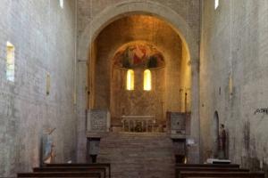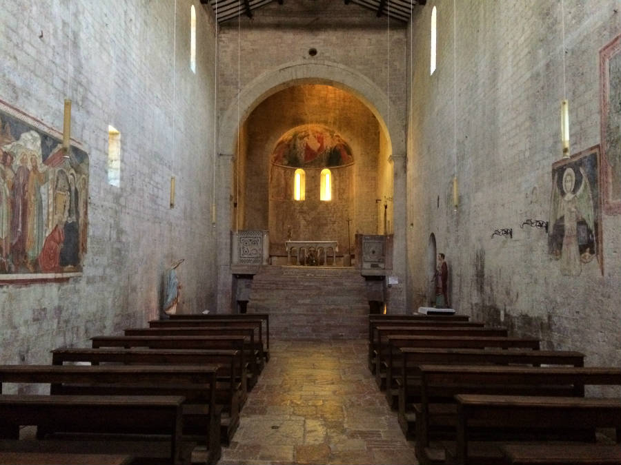L’interno è ad una sola navata con pavimento in pietra nel quale si aprono alcune tombe e due epigrafi romane: una delle quali è inserita nel pavimento, subito dopo la porta di ingresso. Il presbiterio rialzato di 7 gradini, era riservato alla liturgia monastica e delimitato da paliotti in pietra a decorazione cosmatesca con mosaici a labirinto, dove il monaco leggeva al popolo la Bibbia. L’abside è circolare e la coperture a capriate.